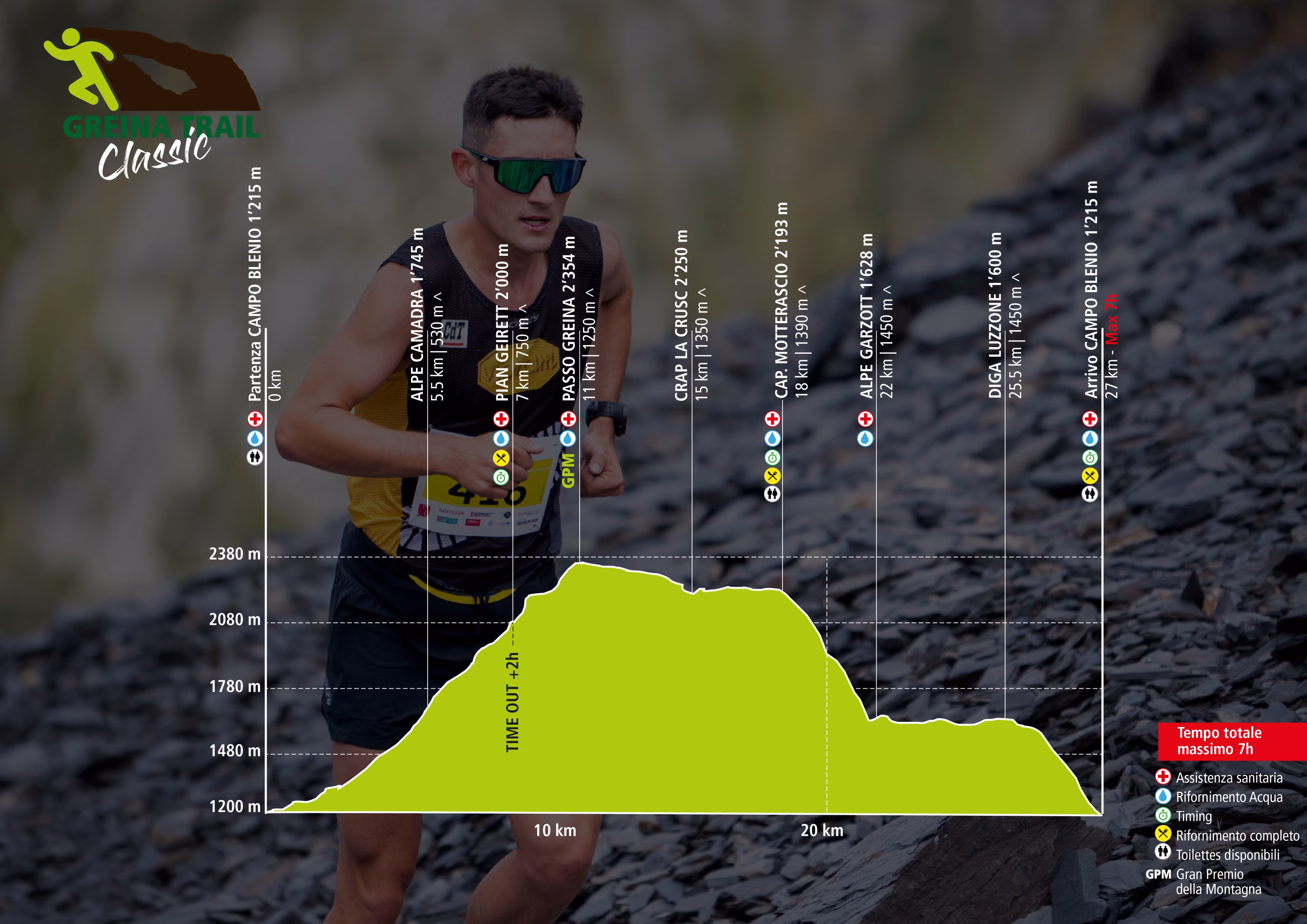 Con 27 km di percorso e un dislivello positivo e negativo di 1440 metri, questa gara è il cuore pulsante del Greina Trail. Giunta alla sua settima edizione, è il tracciato più iconico e amato dai partecipanti.